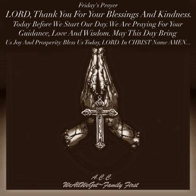 Friday’s Prayer November 8, 2024UncategorizedWeAllWeGot-Family First Good Friday WordPress Prayers Up…🙏🏿🙏🏻🙏🏿🙏🏻 Friday’s Prayer Discover more from WeAllWeGot-Family First Subscribe to get the latest posts sent to your email. Type your email… Subscribe Share on X (Opens in new window) X Share on LinkedIn (Opens in new window) LinkedIn Share on Tumblr (Opens in new window) Tumblr Email a link to a friend (Opens in new window) Email Share on Bluesky (Opens in new window) Bluesky Share on Nextdoor (Opens in new window) Nextdoor Share on WhatsApp (Opens in new window) WhatsApp Share on Telegram (Opens in new window) Telegram Share on Pinterest (Opens in new window) Pinterest Share on Pocket (Opens in new window) Pocket Share on Mastodon (Opens in new window) Mastodon Like Loading...