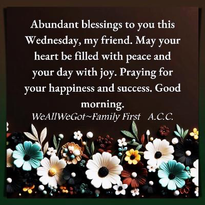 Wednesday’s Blessing March 12, 2025UncategorizedWeAllWeGot-Family First Morning WordPress…🙏🏿🙏🙏🏿🙏 Wednesday’s Blessing Discover more from WeAllWeGot-Family First Subscribe to get the latest posts sent to your email. Type your email… Subscribe Click to share on X (Opens in new window) X Click to share on LinkedIn (Opens in new window) LinkedIn Click to share on Tumblr (Opens in new window) Tumblr Click to email a link to a friend (Opens in new window) Email Click to share on Bluesky (Opens in new window) Bluesky Click to share on Nextdoor (Opens in new window) Nextdoor Click to share on WhatsApp (Opens in new window) WhatsApp Click to share on Telegram (Opens in new window) Telegram Click to share on Pinterest (Opens in new window) Pinterest Click to share on Pocket (Opens in new window) Pocket Click to share on Mastodon (Opens in new window) Mastodon Like Loading...