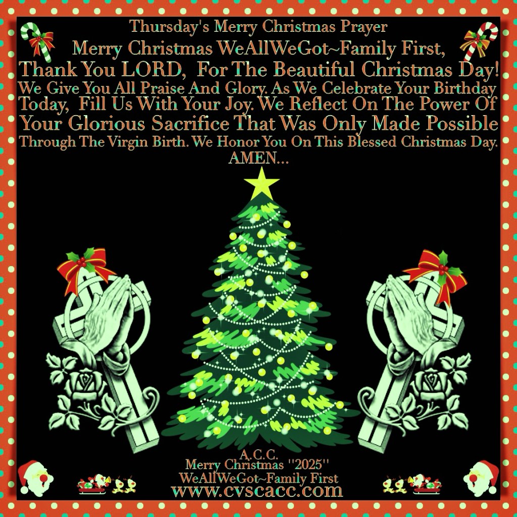 Thursday’s Prayer “Merry Christmas 2025” December 25, 2025UncategorizedWeAllWeGot-Family First Morning WordPress…🙏🏿🙏🙏🏿🙏 Thursday’s Prayer “Merry Christmas 2025” Discover more from WeAllWeGot-Family First Subscribe to get the latest posts sent to your email. Type your email… Subscribe Click to share on X (Opens in new window) X Click to share on LinkedIn (Opens in new window) LinkedIn Click to share on Tumblr (Opens in new window) Tumblr Click to email a link to a friend (Opens in new window) Email Click to share on Bluesky (Opens in new window) Bluesky Click to share on Nextdoor (Opens in new window) Nextdoor Click to share on WhatsApp (Opens in new window) WhatsApp Click to share on Telegram (Opens in new window) Telegram Click to share on Pinterest (Opens in new window) Pinterest Click to share on Pocket (Opens in new window) Pocket Click to share on Mastodon (Opens in new window) Mastodon Like Loading...