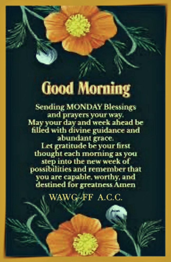 Monday’s Blessing January 19, 2026UncategorizedWeAllWeGot-Family First Good Monday Morning WordPress…🙏🏿🙏🙏🏿🙏 Monday’s Blessing Discover more from WeAllWeGot-Family First Subscribe to get the latest posts sent to your email. Type your email… Subscribe Share on X (Opens in new window) X Share on LinkedIn (Opens in new window) LinkedIn Share on Tumblr (Opens in new window) Tumblr Email a link to a friend (Opens in new window) Email Share on Bluesky (Opens in new window) Bluesky Share on Nextdoor (Opens in new window) Nextdoor Share on WhatsApp (Opens in new window) WhatsApp Share on Telegram (Opens in new window) Telegram Share on Pinterest (Opens in new window) Pinterest Share on Pocket (Opens in new window) Pocket Share on Mastodon (Opens in new window) Mastodon Like Loading...