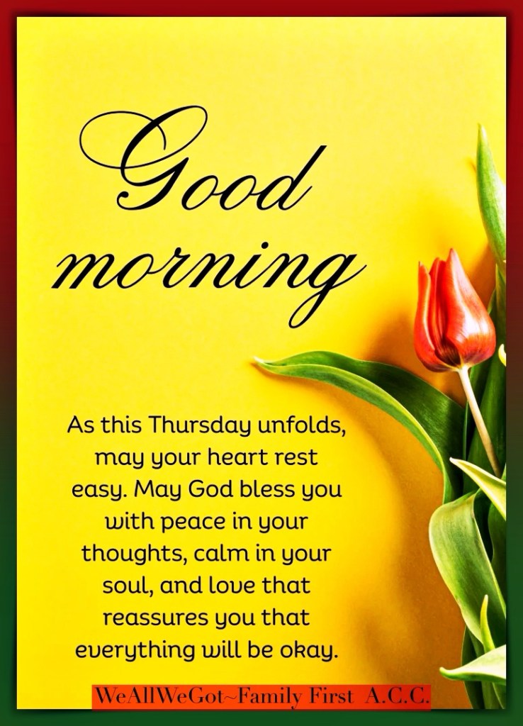 Thursday’s Blessing April 16, 2026UncategorizedWeAllWeGot-Family First Good Thursday Morning WordPress…🙏🏿🙏🙏🏿🙏 Thursday’s Blessing Discover more from WeAllWeGot-Family First Subscribe to get the latest posts sent to your email. Type your email… Subscribe Share on X (Opens in new window) X Share on LinkedIn (Opens in new window) LinkedIn Share on Tumblr (Opens in new window) Tumblr Email a link to a friend (Opens in new window) Email Share on Bluesky (Opens in new window) Bluesky Share on Nextdoor (Opens in new window) Nextdoor Share on WhatsApp (Opens in new window) WhatsApp Share on Telegram (Opens in new window) Telegram Share on Pinterest (Opens in new window) Pinterest Share on Mastodon (Opens in new window) Mastodon Like Loading...