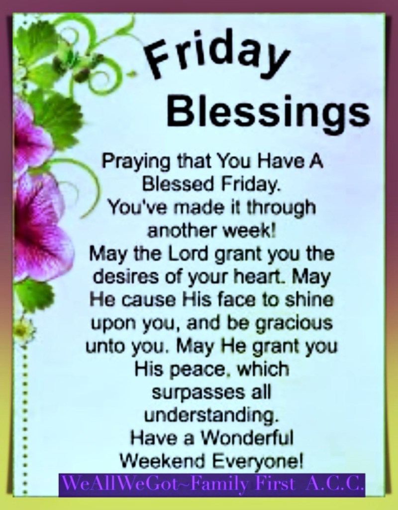 Friday’s Blessing April 17, 2026UncategorizedWeAllWeGot-Family First Good Friday Morning WordPress…🙏🏿🙏🙏🏿🙏 Friday’s Blessing Discover more from WeAllWeGot-Family First Subscribe to get the latest posts sent to your email. Type your email… Subscribe Share on X (Opens in new window) X Share on LinkedIn (Opens in new window) LinkedIn Share on Tumblr (Opens in new window) Tumblr Email a link to a friend (Opens in new window) Email Share on Bluesky (Opens in new window) Bluesky Share on Nextdoor (Opens in new window) Nextdoor Share on WhatsApp (Opens in new window) WhatsApp Share on Telegram (Opens in new window) Telegram Share on Pinterest (Opens in new window) Pinterest Share on Mastodon (Opens in new window) Mastodon Like Loading...